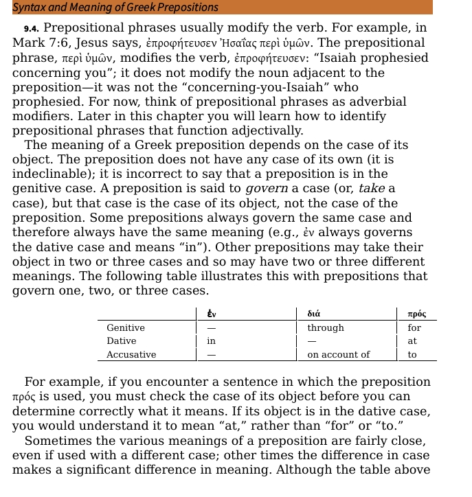 A preposition is just a small linking word that marks a relationship—words like “from,” “to,” “in,” “with,” “by,” “through.” Greek uses prepositions the same way. For example, ἐκ means “from / out of.” The genitive is a case—a noun ending that signals a relationship between words. Think of it like how English suffixes can signal relationships or functions (e.g., hike → hiking marks an activity; enjoy → enjoyment marks a state/thing). Some examples