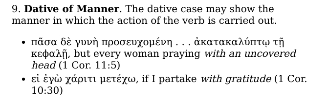 That matters for Luke 1:44 because ἐν ἀγαλλιάσει most naturally modifies the verb, not some nearby noun. When grammarians say prepositional phrases often function adverbially, they mean such phrases usually tell you something about the action: how, where, when, or why it happened. In English, an adverb works the same way. If I say, “He spoke boldly,” the word “boldly” tells you how he spoke. The same basic point applies here. ἐν ἀγαλλιάσει tells us how the baby leaped. Since ἐν governs the dative, ἀγαλλιάσει is in the dative, and as a manner phrase it describes the way the action is carried out. The natural sense of the clause, then, is not that Elizabeth felt joy while the baby happened to move, but that the baby leaped with joy.